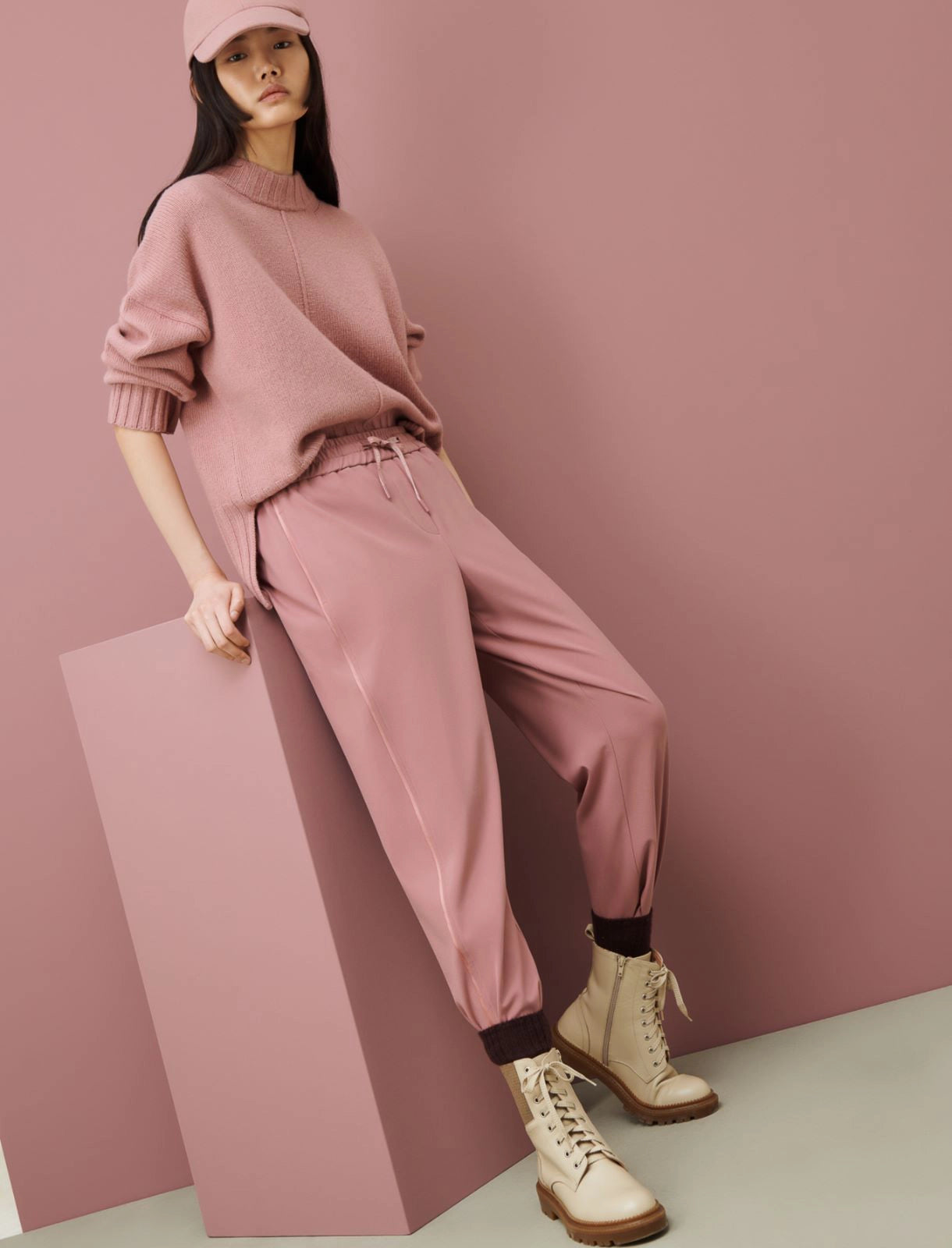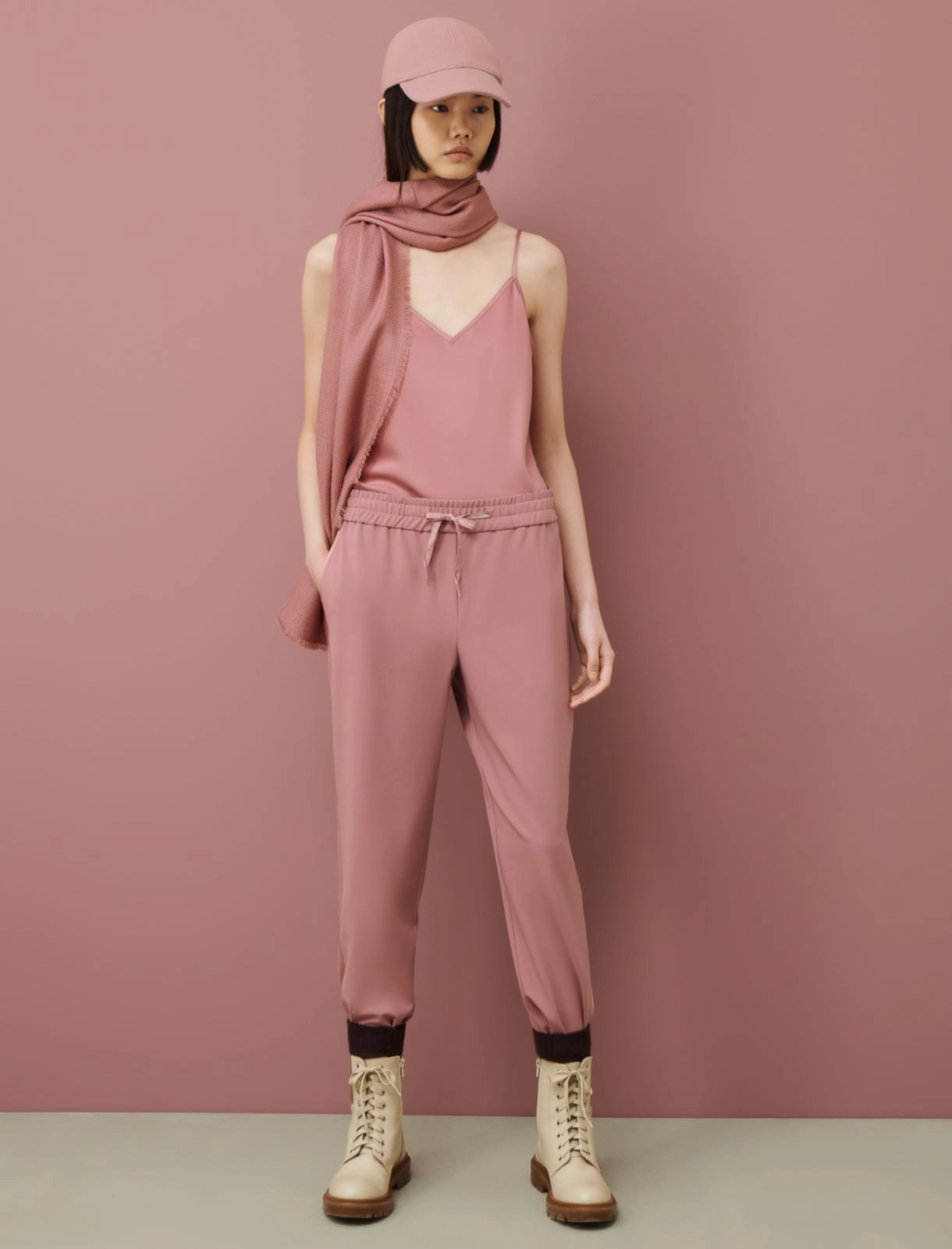 Stretch canvas joggers. Drawstring-embellished elasticated waistband, in-seam side pockets and a welt rear pocket. This item is made from polyester obtained from recycled plastic; the viscose is also made from cellulose, a fibre obtained without endangering forest resources. The model is part of the Marella MONOCHROME collection: monochrome silhouettes in selected materials and impeccable layered stylings for luxury outfits.