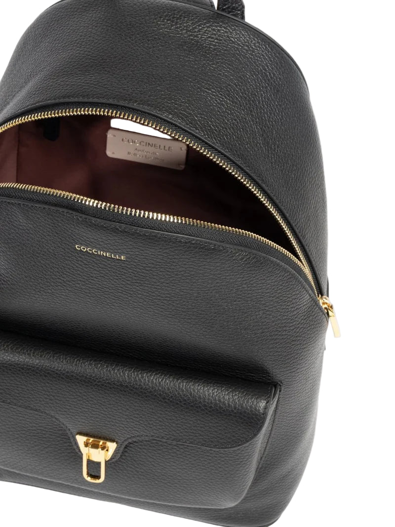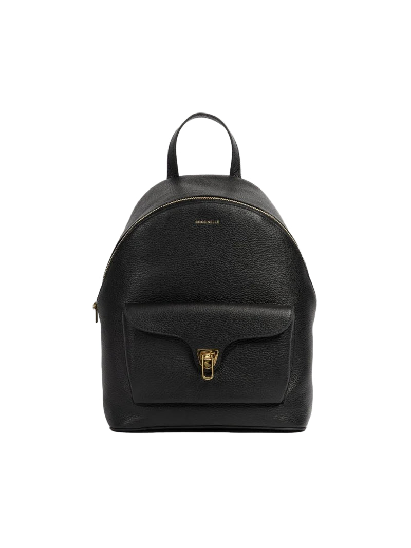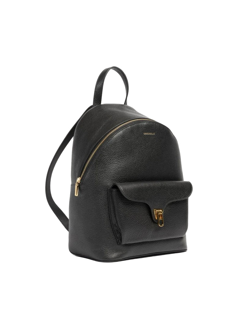 Coccinelle Beat is one of the brand’s iconic lines: the distinctive flap closure with plectrum is the symbol of Coccinelle’s identity, reimagined for this collection with elegant, modern functionality. This backpack with zip fastening is the ideal travel companion, a perfect mix of structure and softness, practicality and contemporary design. This model is made with leather processed using specialised machines and then tumbled to maintain its softness. This is a very robust, easy to clean leather, making it ideal for everyday use.