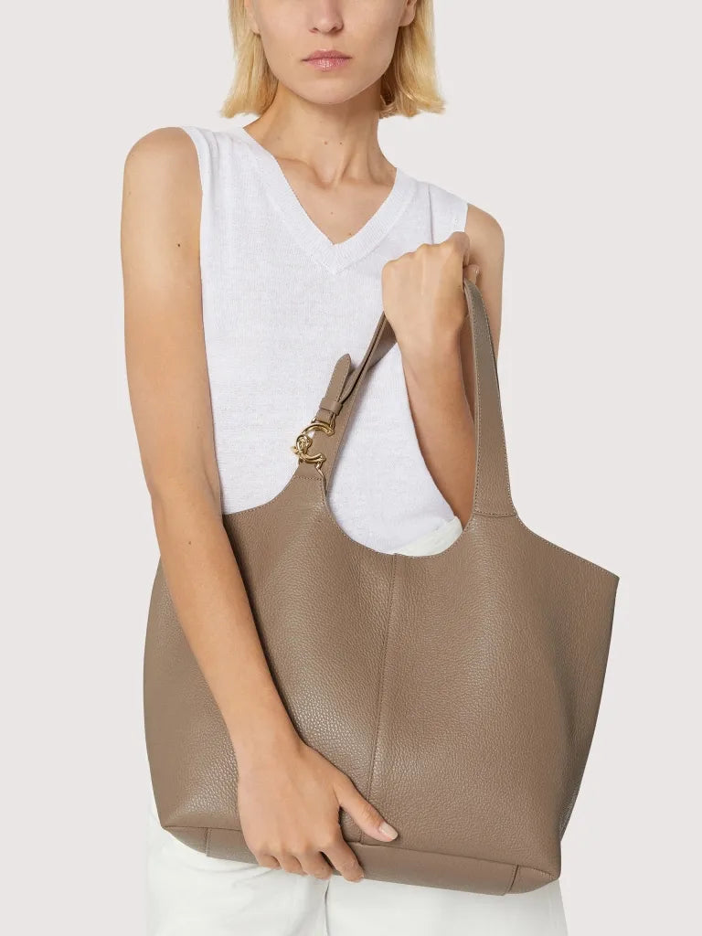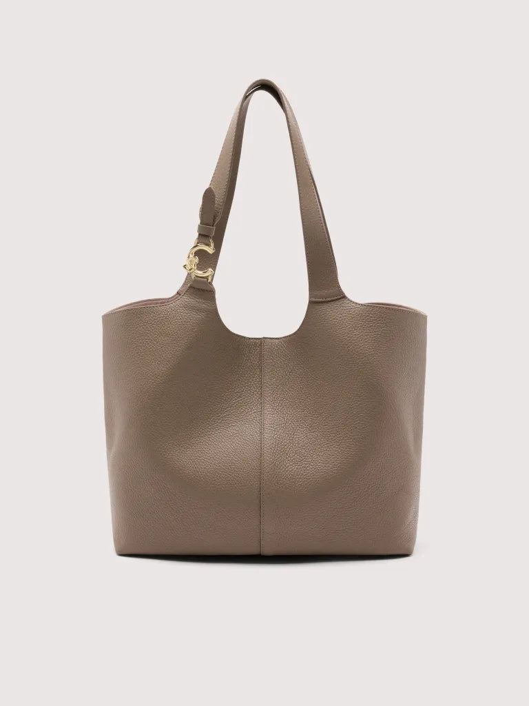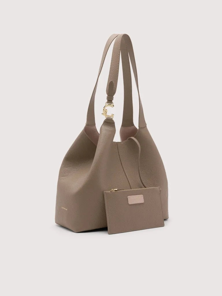 Coccinelle C-Easy is a tote bag featuring sinuous curves that highlight the beauty of the leather. Functionality is expressed by the capacity and the inner pouch, but the core of the design lies in the fastening, which can be done either centrally via a magnet, leaving the sides open, or by folding the sides through the lace and button stud closure. There is no lack of a metallic element in the handle with the new C-Me logo, which brightens up this bag with its extremely versatile soul. This model is made with leather processed using specialised machines and then tumbled to maintain its softness. This is a very robust, easy to clean leather, making it ideal for everyday use.