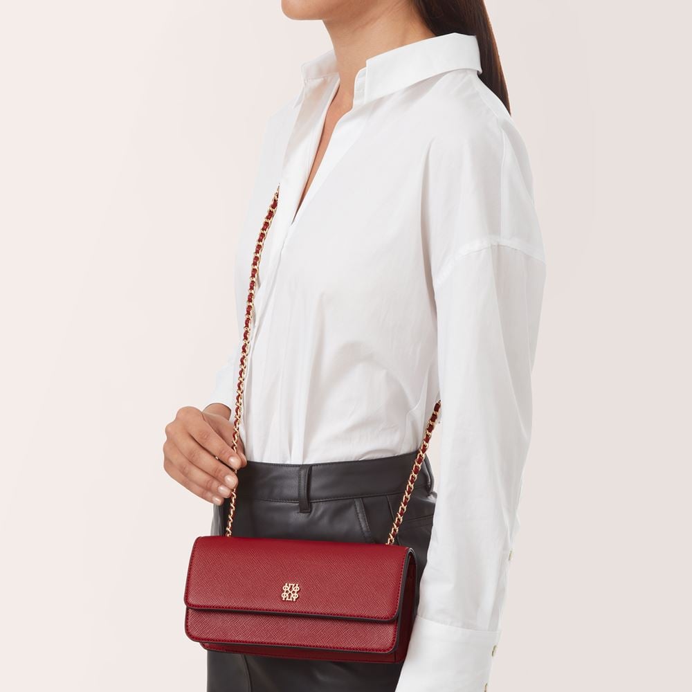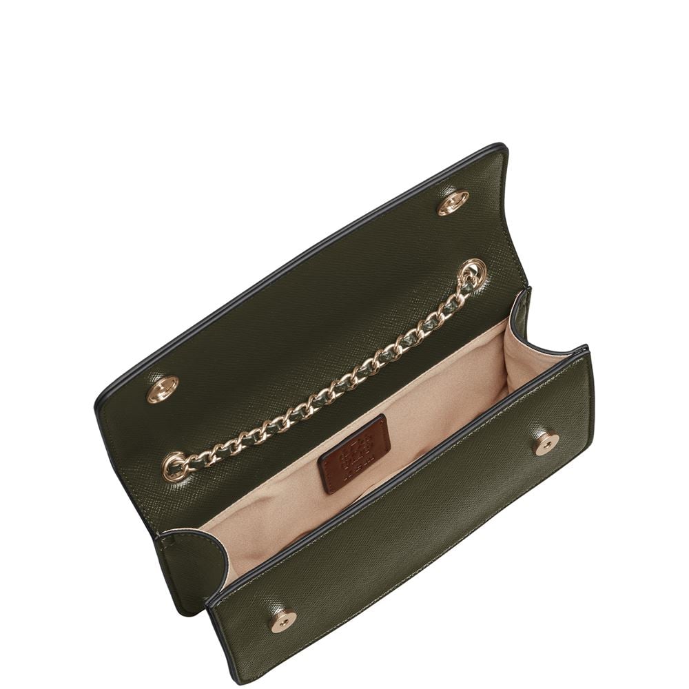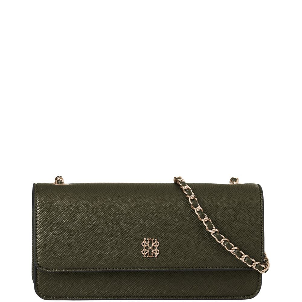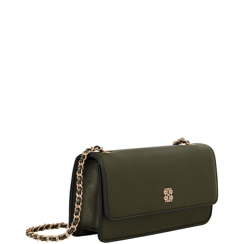 Crossbody bag in Linea synthetic material. Slim, elegant silhouette with an open interior. Flap and magnetic snap closure. Strap with decorative chain can be doubled up on shoulder.