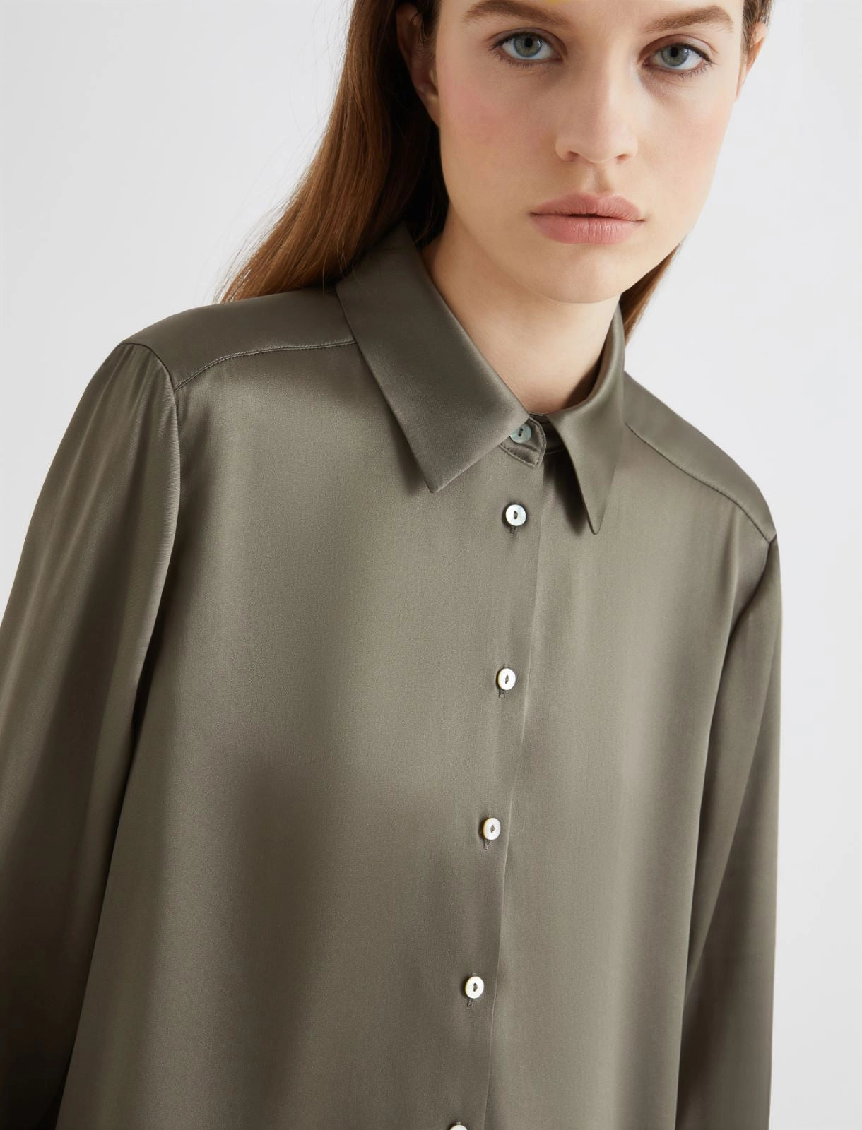 Like a caress on the skin: this silk-blend satin shirt will elevate every look with its sophisticated touch. Wear with fluffy sweaters and tailored trousers for an urban yet chic look.