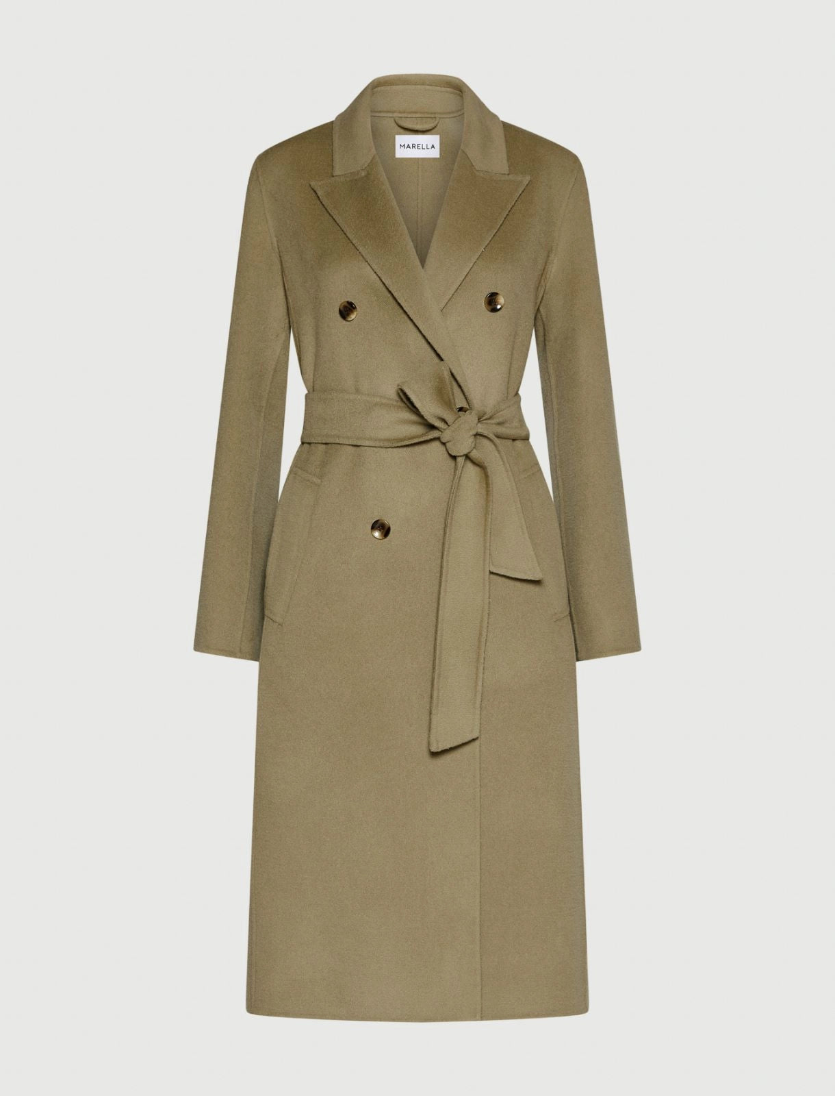 A city chic version of the majestic coat: a new take on the double-breasted cut with a belt and buttons to adjust the silhouette at will. The soft wool is a warm embrace for day-to-night wear.