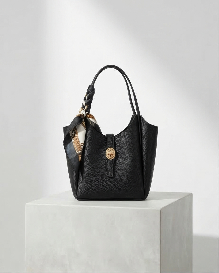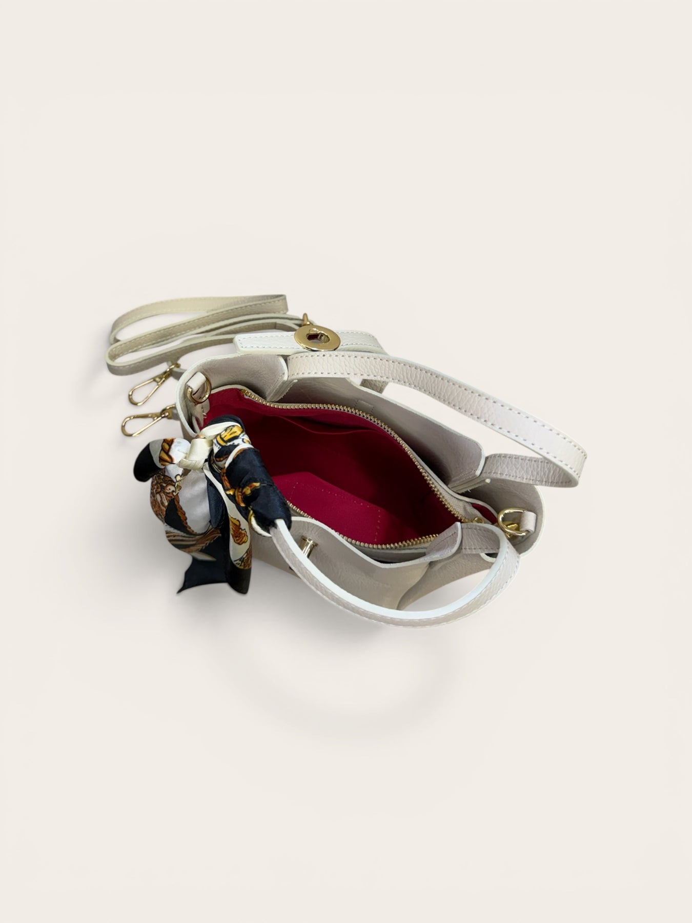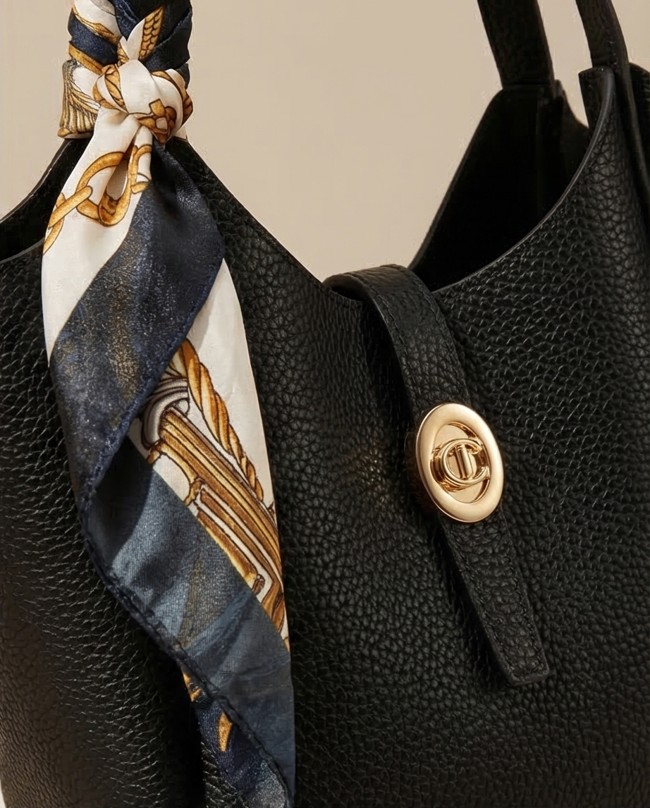 Δερμάτινο τσαντακι με χρυσή λεπτομέρια και μαντήλι .
