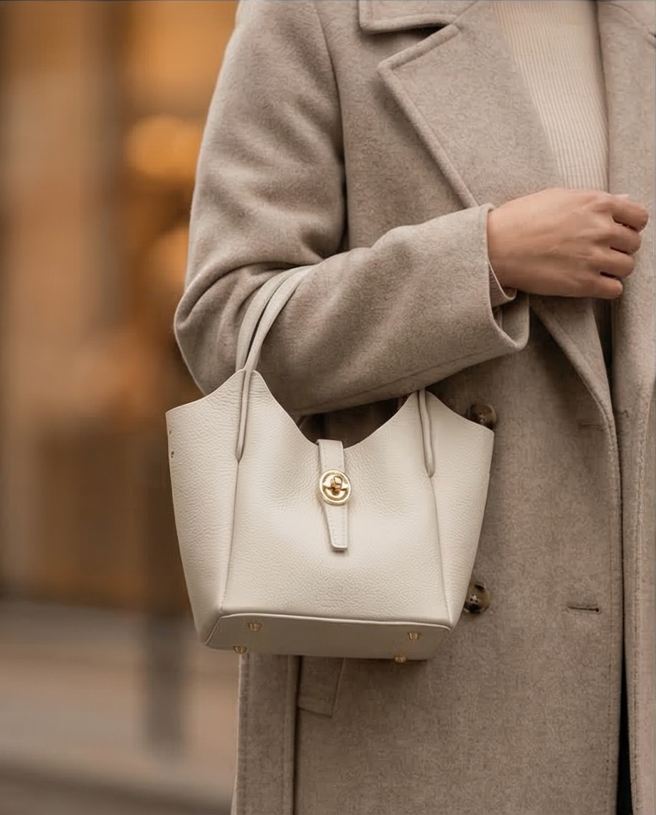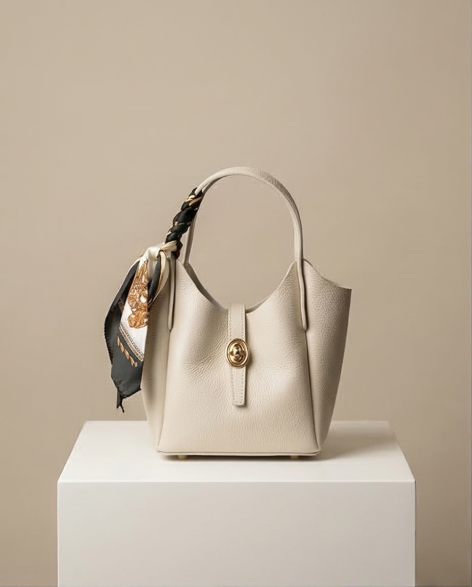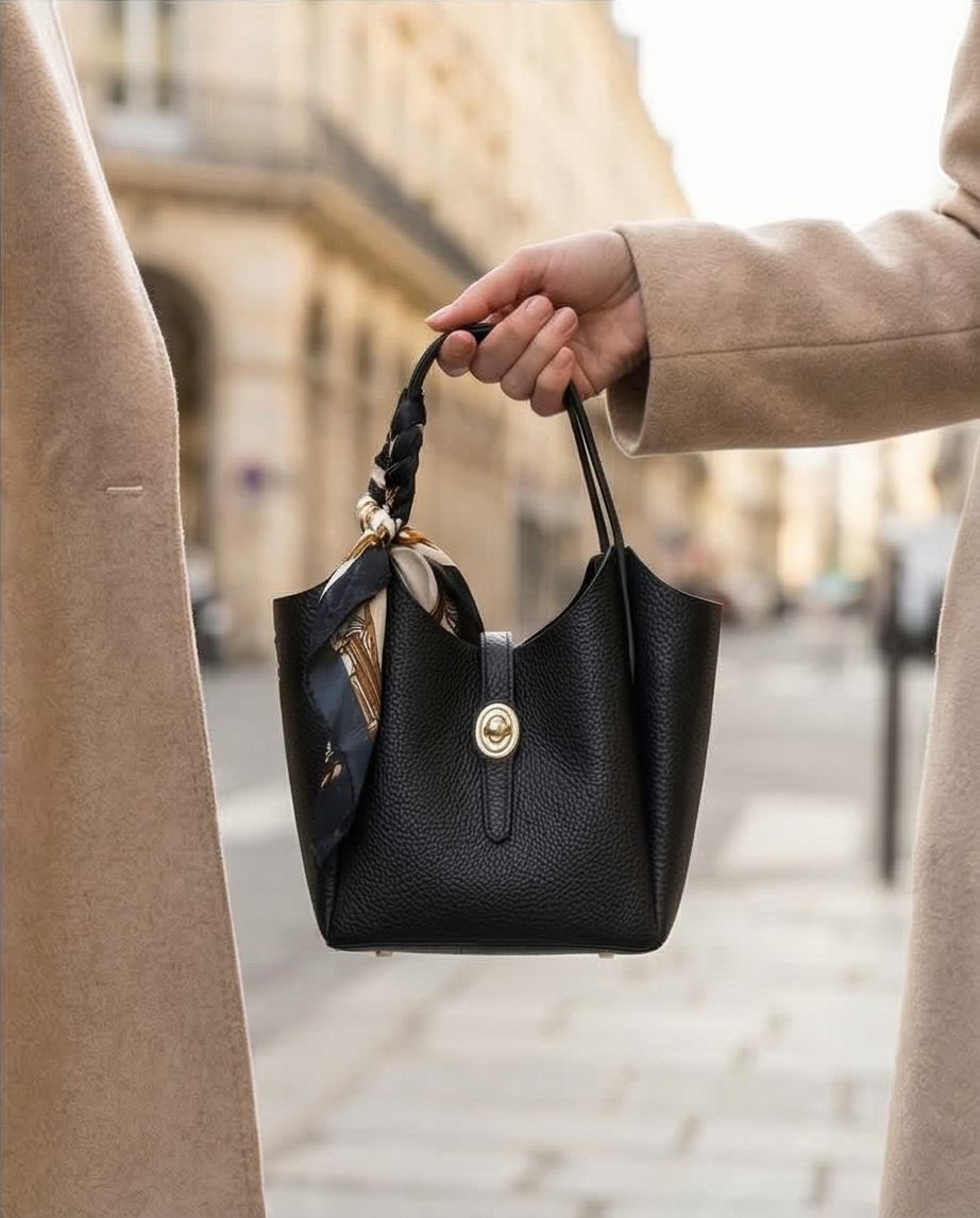 Δερμάτινο τσαντακι με χρυσή λεπτομέρια και μαντήλι .