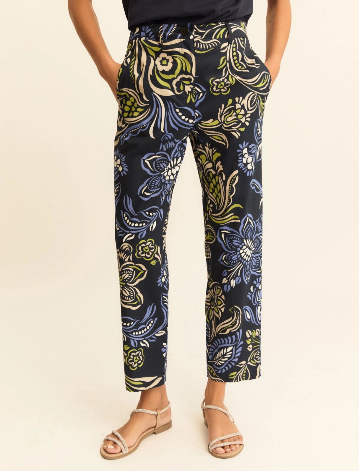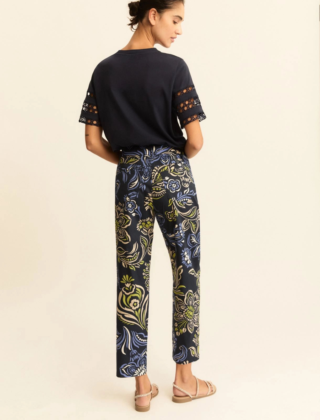 A summer take on the timeless chino trousers: the cool and light cotton boasts a weftwise stretch to facilitate movement. The contoured rear yoke skims the figure and bestows a feminine fit.